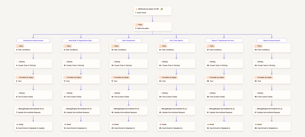 I designed and implemented a Zapier-based automation to streamline internal IT report and dashboard requests submitted through ManageEngine ServiceDesk. This workflow eliminates manual task creation and ensures requests are routed accurately based on request type.