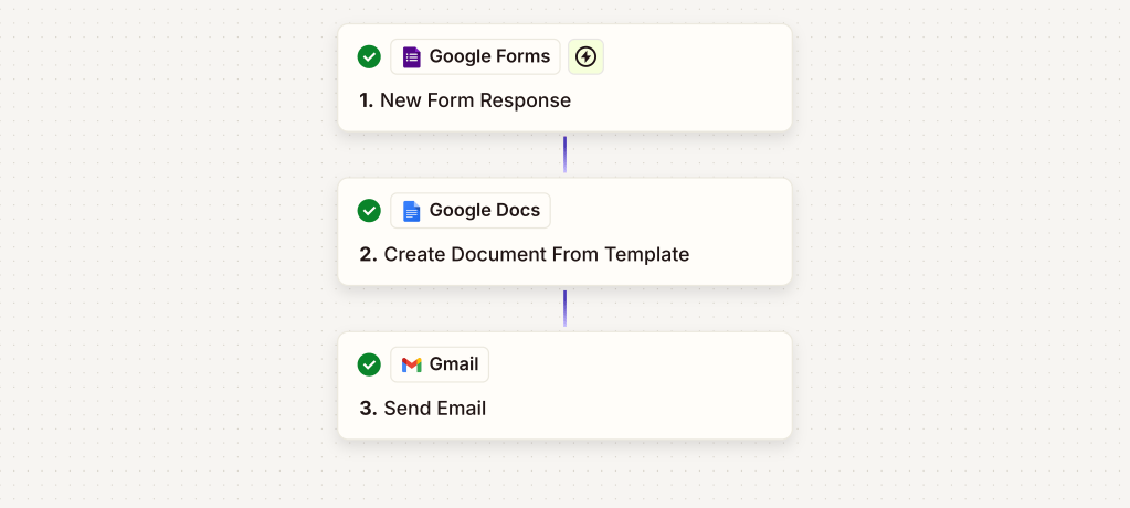 The document was integrated into a Zapier automation using the “Create Document from Template” step. Data from form submissions or a database could instantly populate the certificate and export it as a PDF—ready for delivery.