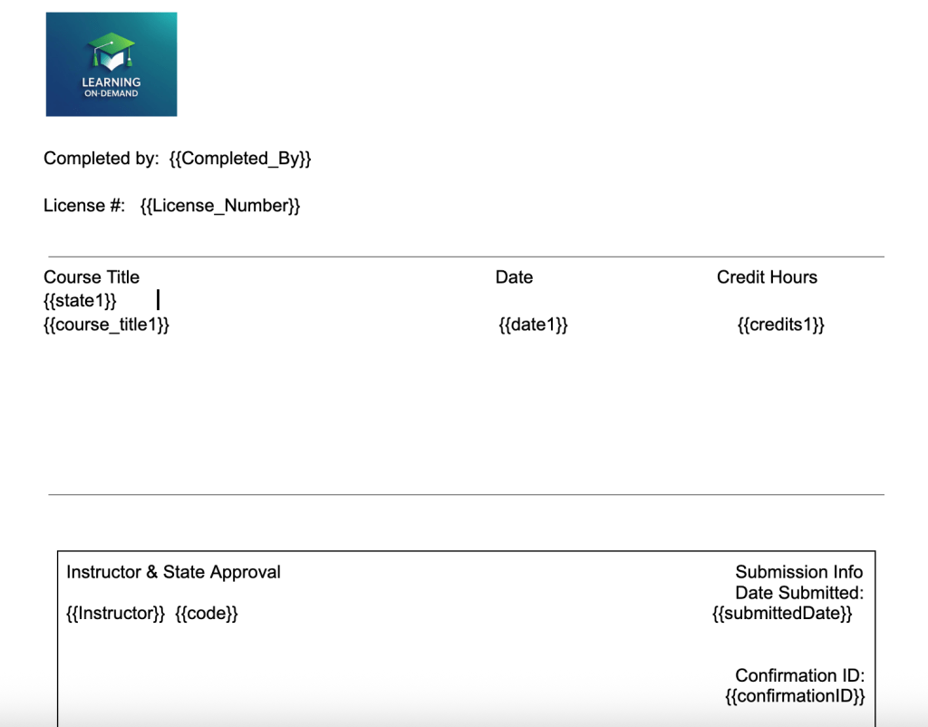 [Name], [LicenseNumber], [Instructor] Course details up to 5 entries: [CourseTitle1], [State1], [Date1], [Hours1] Approval and course numbers by state: [ApprovalCodeCA], [CourseNumberTX], etc. Submission metadata: [SubmissionDate], [ConfirmationID]
