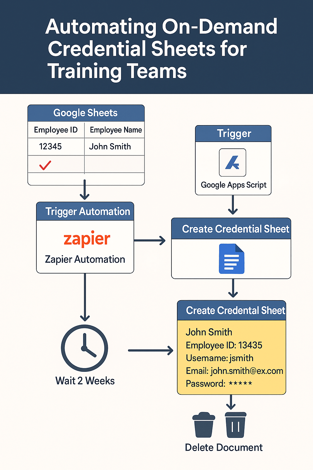 The Training Department needed a reliable and efficient way to generate employee credential sheets on an ad hoc basis. These documents needed to include key Onelogin account details and be automatically deleted after two weeks to maintain data security.