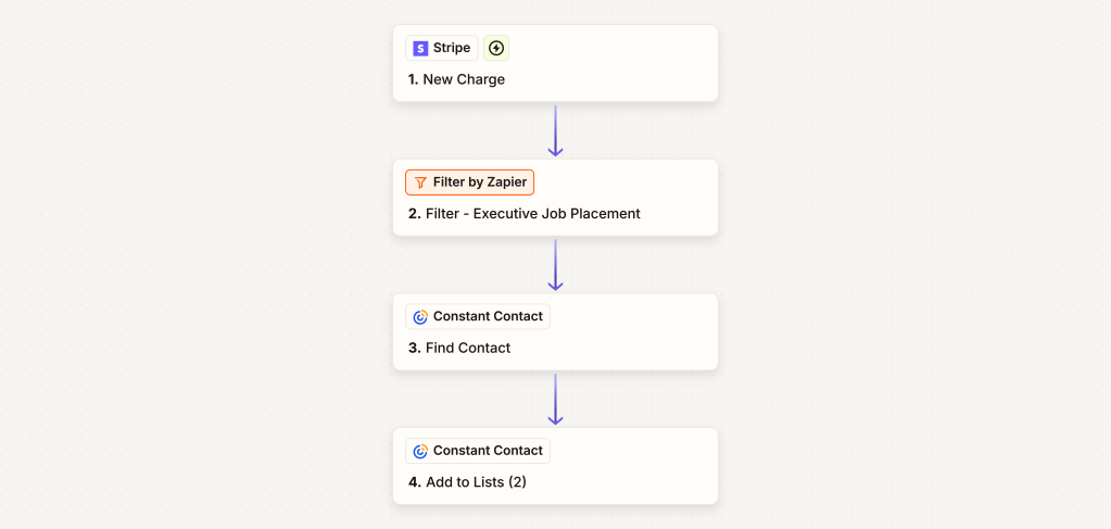 The objective was to automate the process from payment to onboarding. Once a successful charge was detected in Stripe, the customer needed to be identified in Constant Contact and added to the appropriate email lists, triggering a welcome automation.