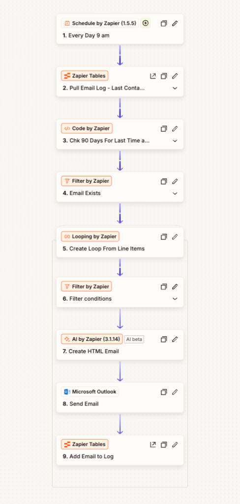 This automation helps our team consistently follow up with customers who haven’t placed an order in the last 90 days. Every morning at 9:00 AM, the workflow checks for eligible customers, generates a personalized HTML email, sends it via Outlook, and logs the send to a central record for tracking and compliance.