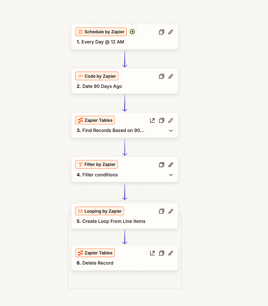 Status != Activeto avoid deleting in-flight items. - Looping by Zapier – Iterate through the found record IDs.