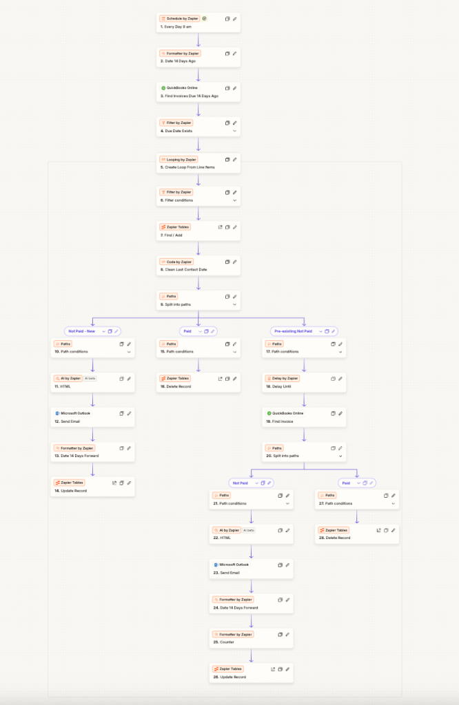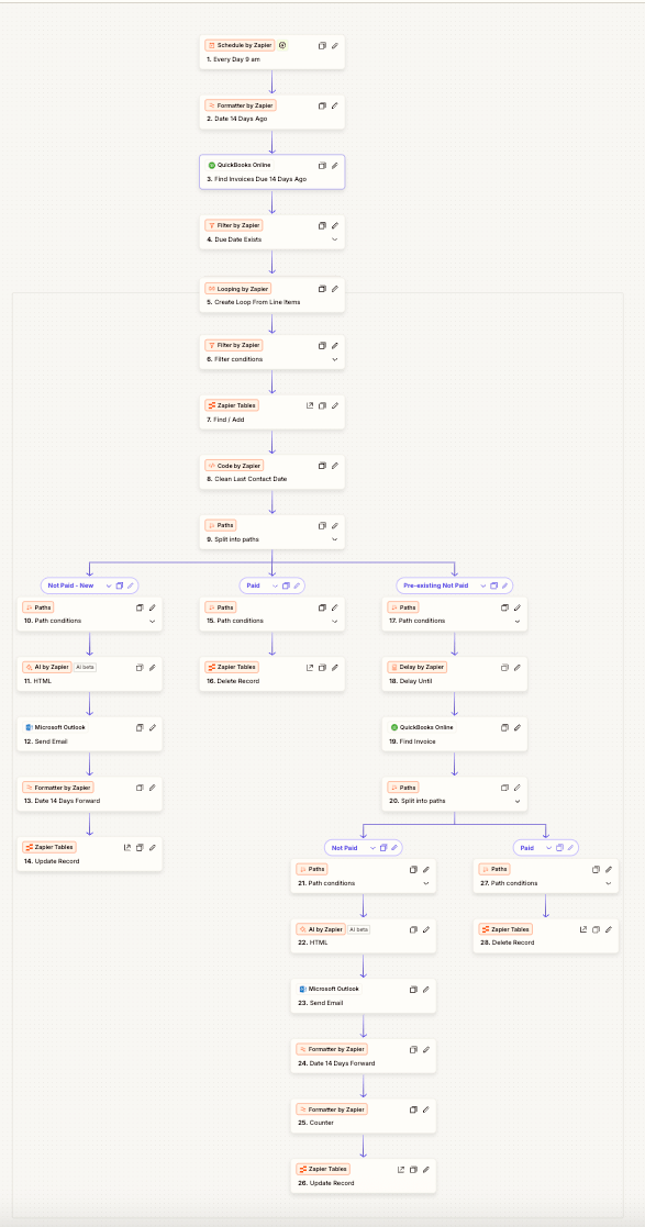 // output: cutoff (string) const cutoff = new Date(Date.now() - 14*24*60*60*1000).toISOString(); return { cutoff }; - Find Invoices (Zapier Tables/Your Source) – Query for invoices where Due Date == cutoff (or