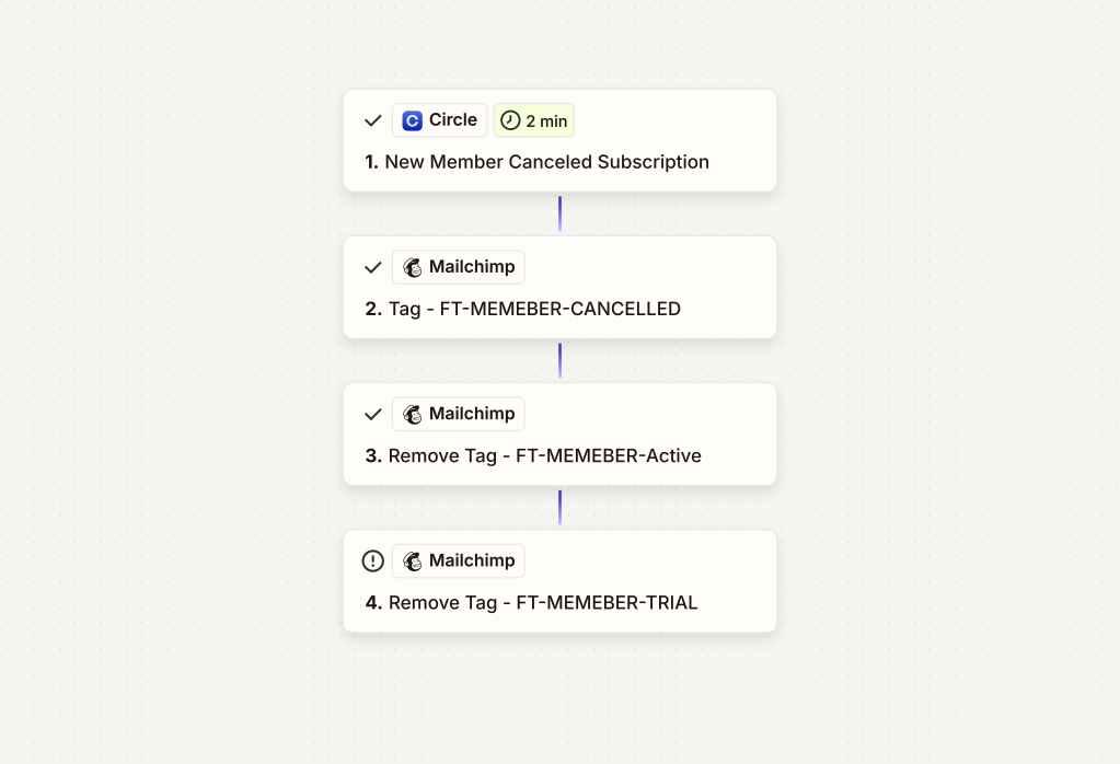 I built an automation that keeps Mailchimp perfectly in sync with Circle so each contact always has exactly one membership-state tag: TRIAL, ACTIVE, or CANCELLED.